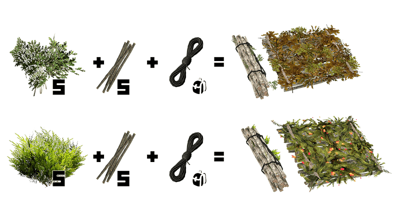 5 Веток с мелких лиственных деревьев + 5 Коротких палок + Верёвка в инвентаре = Схрон из веток обычный