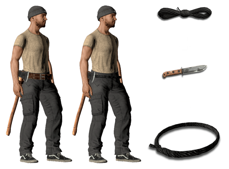 Два вида поясов - самодельный из верёвки и заводской кожаный. Пояса имеют два слота: 1) большие топоры, биты, кувалды, лом. 2) длинные мачете. Кожаный пояс вручит вам НПС охотник, пояс из верёвки вы можете создать сами.