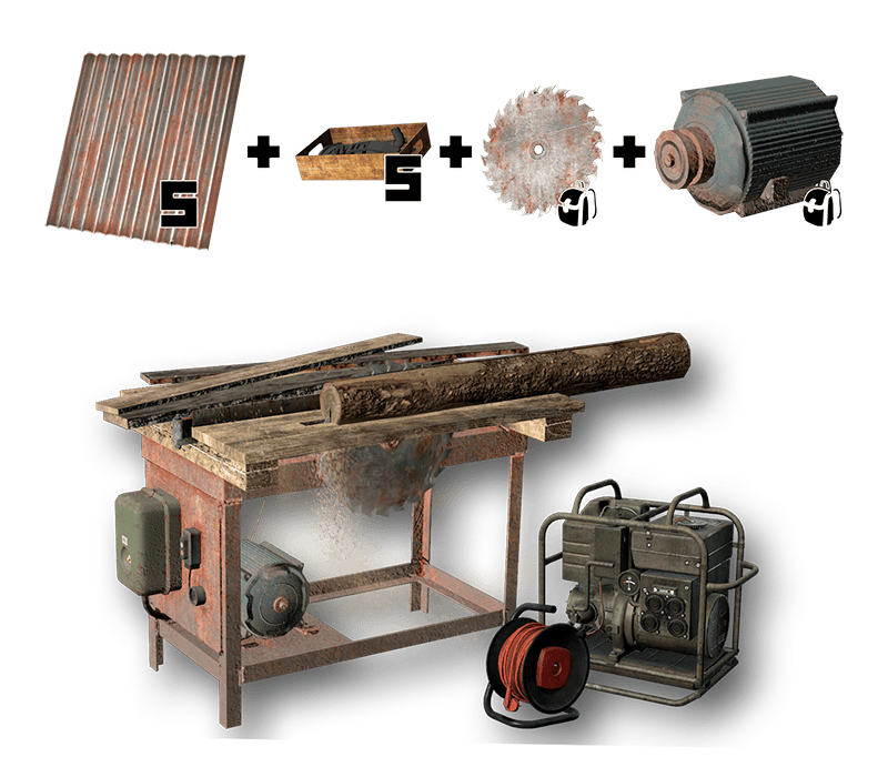 5 Листов метала + 5 Коробок запчастей + Диск и Двигатель от пилы в инвентаре = Набор для установки циркулярной пилы