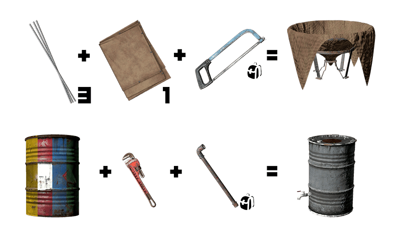 3 Арматуры + 1 Брезент + Набор инструмента в инвентаре = Воронка для сбора воды