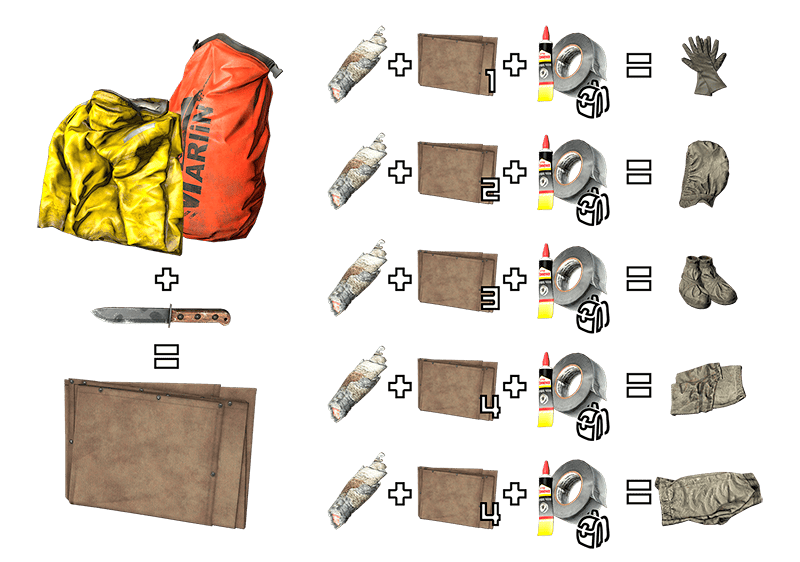 - 1шт Шкура + 4шт Брезент + Супер клей и Скотч в инвентаре = Штаны ХК