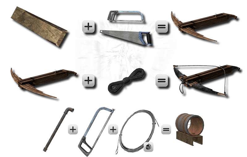 - Труба + Ножовка + Проволока (в инвентаре) = Прицел