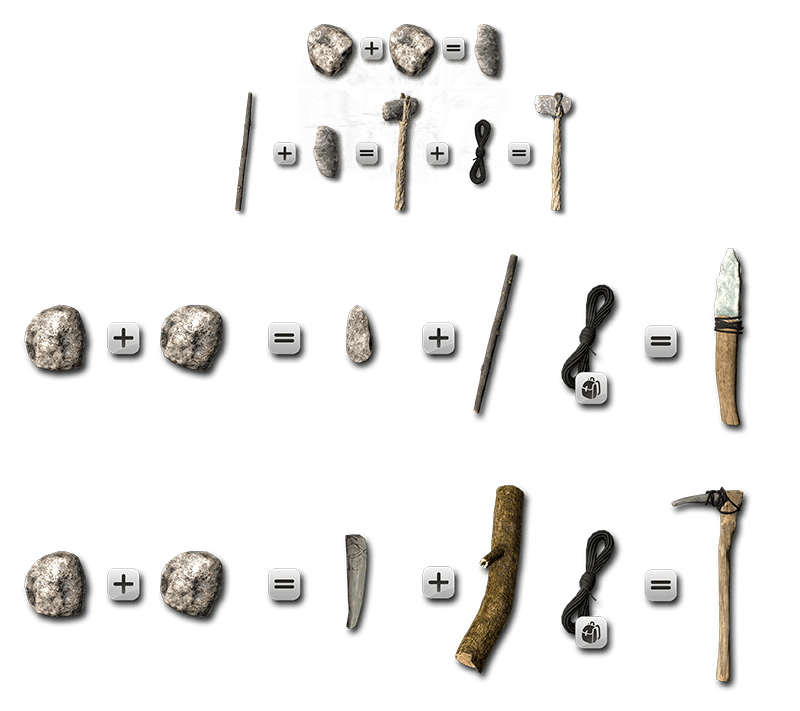 Каменный нож + Короткая палка и Верёвка(в инвентаре) = Улучшенный каменный нож