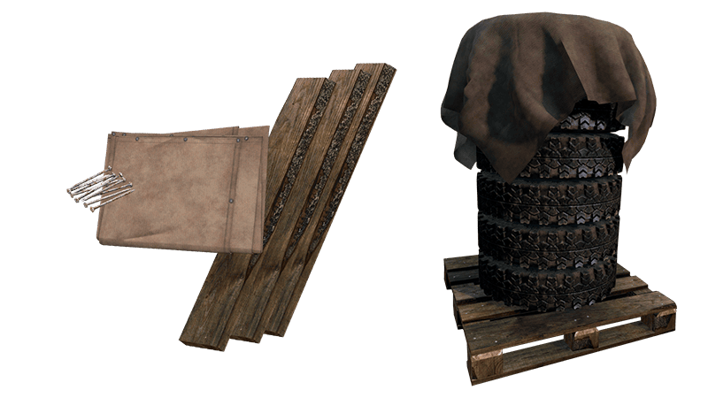 10 Досок + 30 Гвоздей + 1 Брезент в инвентаре