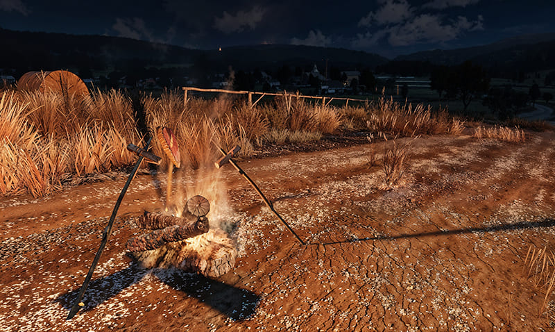 - Добавлена возможность жарить еду на палках установленных вокруг костра.