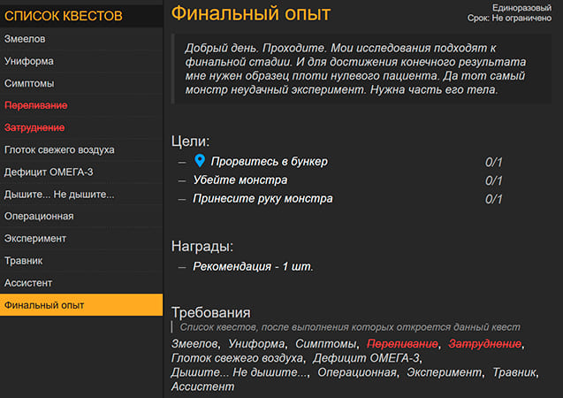 В данном пункте будет видно какие необходимо выполнить квесты для открытия того или иного квеста. Пометки "выполненый квест" будут визуально отображаться в данном пункте тоже. Теперь будет легче понять сколько нужно сделать квестов и каких именно для открытия нового.